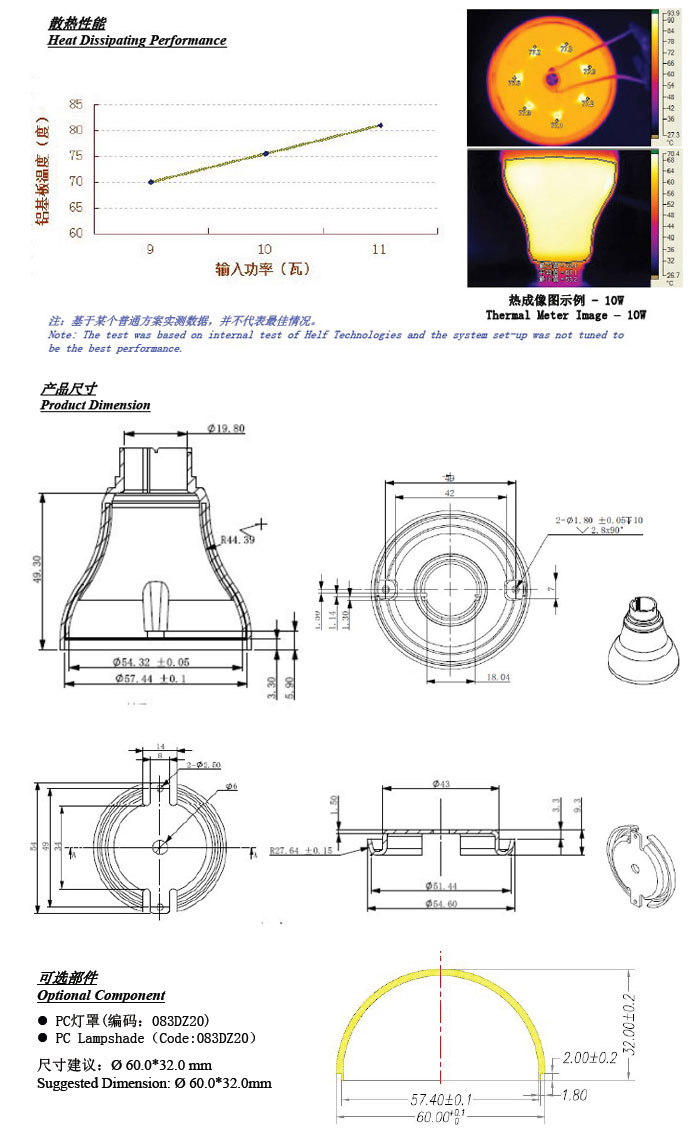 G60球泡散热器 | HFG0023 | 白料免喷 | 9-12W | 60mm | E27 | 49g+11g | 100 PCS/箱 |